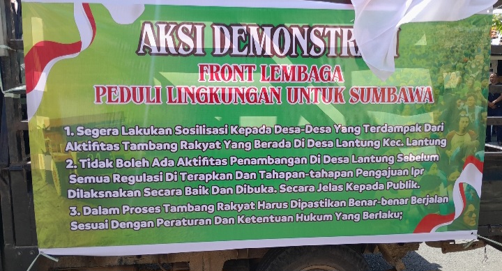 Sumbawa Besar, bidikankameranews.com – Aksi unjuk rasa yang dilakukan oleh Front Lembaga Peduli Lingkungan Untuk Masyarakat pada Kamis, 18 September 2025, di depan Mako Polres Sumbawa dan Kantor Bupati Sumbawa menjadi sorotan utama. Aksi ini menuntut penghentian aktivitas pertambangan rakyat di Kecamatan Lantung, yang dinilai ilegal dan merusak lingkungan.