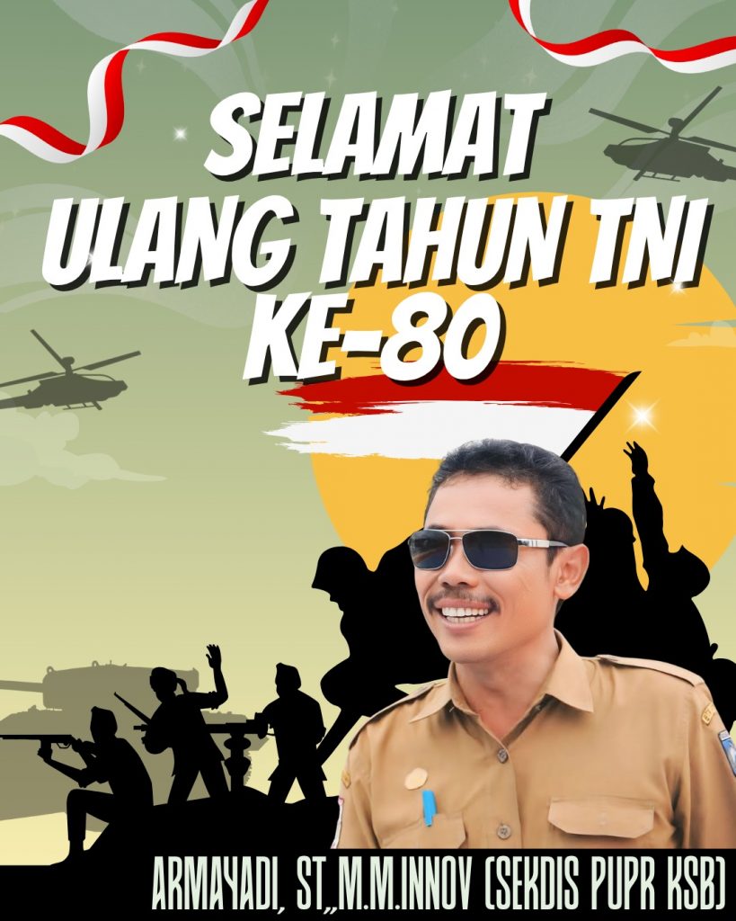 Advertorial Breaking News Iklan Layanan Kadis PUPR KSB Beserta Staf Mengucapkan Selamat Hari TNI Ke – 80 Edi Chandra 2 jam ago Spread the love Kadis PUPR KSB Beserta Staf Mengucapkan Selamat Hari TNI Ke – 80 Spread the love