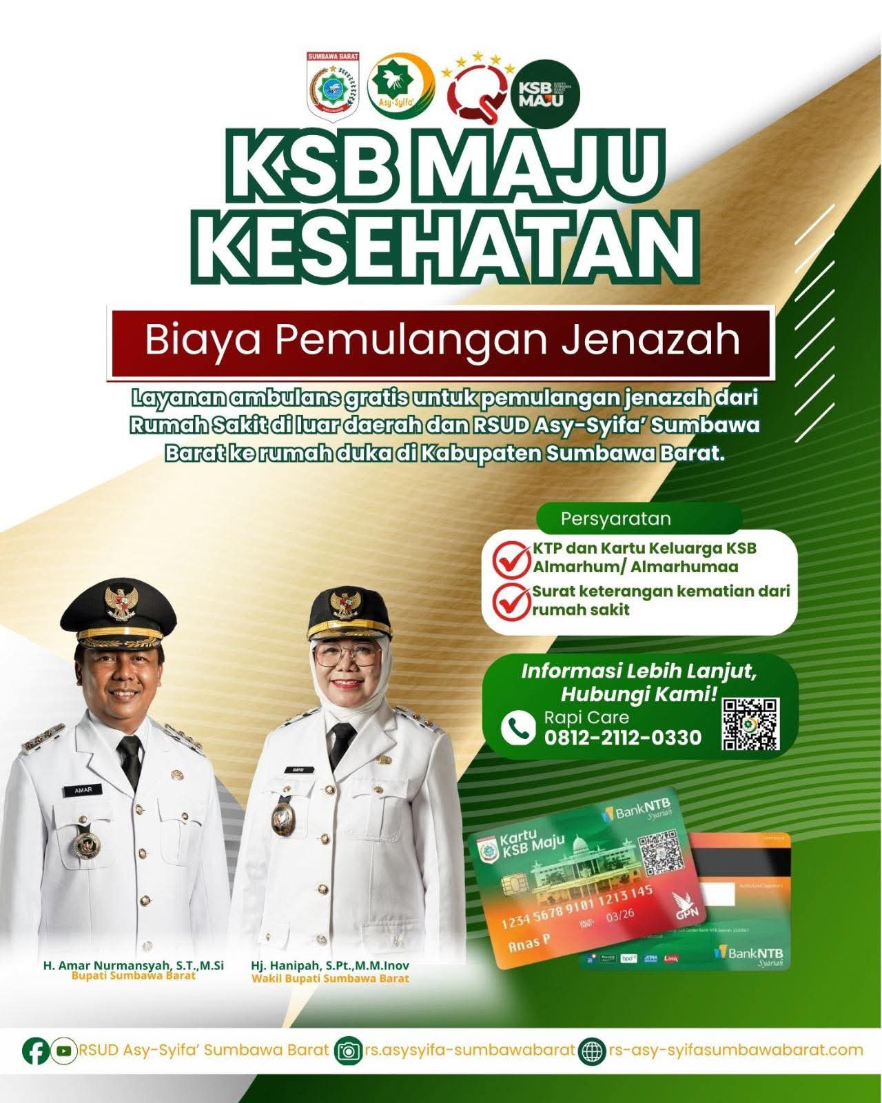 Andy Suhaeri. S.ST., M.M.Inov., Direktur RSUD Asy – Syifa kepada media mengatakan kalau Program KSB Maju Kesehatan di Sumbawa Barat mencakup layanan seperti ambulans gratis (termasuk Tim Reaksi Cepat (TRC)) dan bantuan biaya pendamping pasien rujukan sebesar Rp1,5 juta. Program ini juga mencakup biaya pemulangan jenazah dan memastikan akses layanan kesehatan yang lebih mudah, cepat, dan terjangkau bagi masyarakat melalui Kartu KSB Maju.
