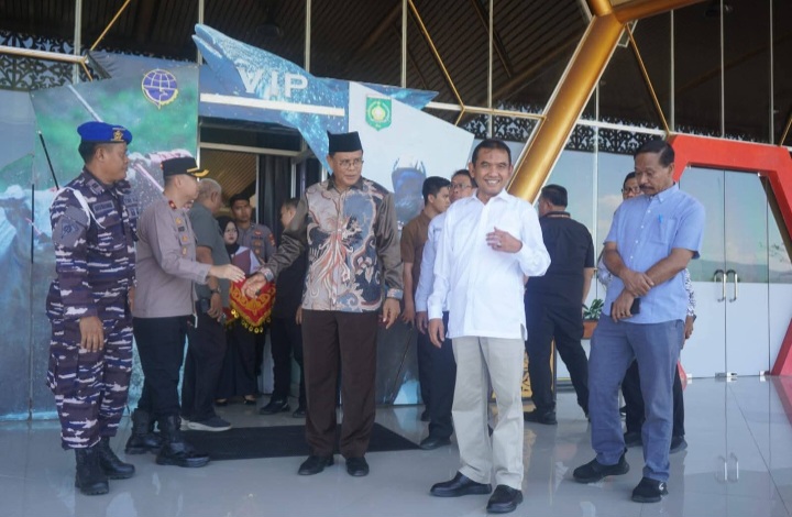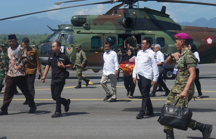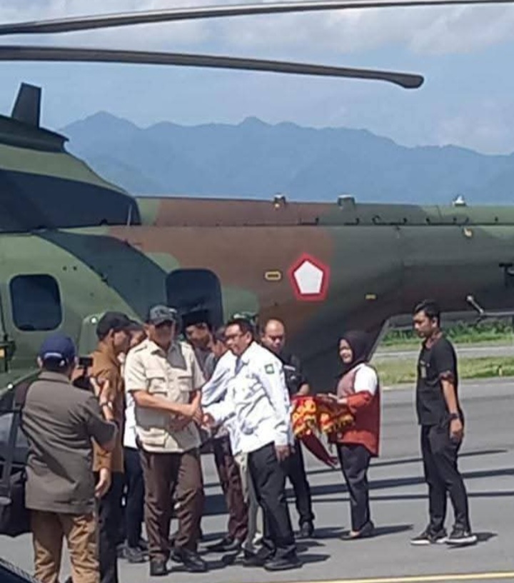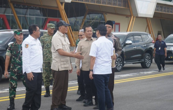 Bupati dan Wakil Bupati Sumbawa, Ir. H. Syarafuddin Jarot, M.P., dan Drs. H. Mohamad Ansori, menyambut kedatangan Menteri Pertahanan Republik Indonesia, Sjafrie Sjamsoeddin, Menteri Kesehatan Republik Indonesia, Budi Gunadi Sadikin, Panglima TNI, Agus Subiyanto, dan Gubernur NTB Lalu Muhammad Iqbal berserta jajarannya, di Bandara Sultan Kaharuddin III, Sumbawa, Sabtu, (18/10/2025). Hadir juga Sekretaris Daerah Kabupaten Sumbawa, Dandim 1607 Sumbawa, serta OPD terkait.