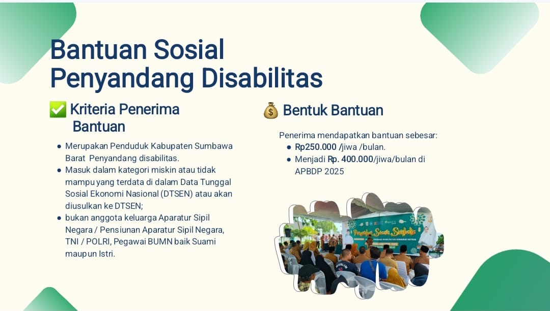Bantuan sosial untuk penyandang disabilitas terintegrasi dalam Kartu KSB Maju Sosial, yang memungkinkan penerima bantuan untuk mencairkan dana melalui Bank NTB.