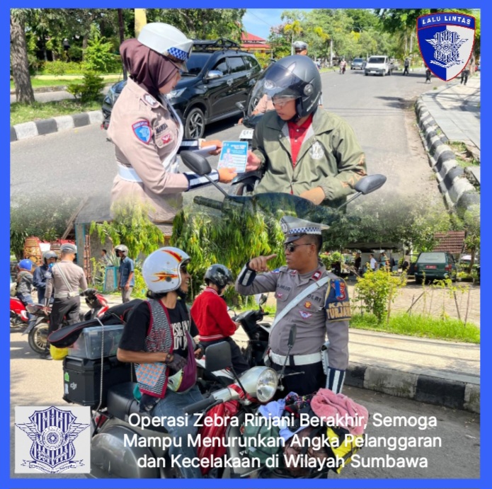 Kapolres Sumbawa AKBP Marieta Dwi Ardhini, S.H., S.I.K., melalui Kasat Lantas, menyampaikan hasil akhir Operasi Zebra Rinjani yang berlangsung sejak 17 November hingga 30 November 2025. “Selama Operasi Zebra berlangsung, kami telah melakukan penindakan Garlantas secara signifikan, yaitu sebanyak 42 penilangan di tempat dan 662 teguran kepada pengguna jalan. Dan kami juga telah mencatat adanya satu kejadian lakalantas yang terjadi dalam periode operasi ini,” ujar Kasat.